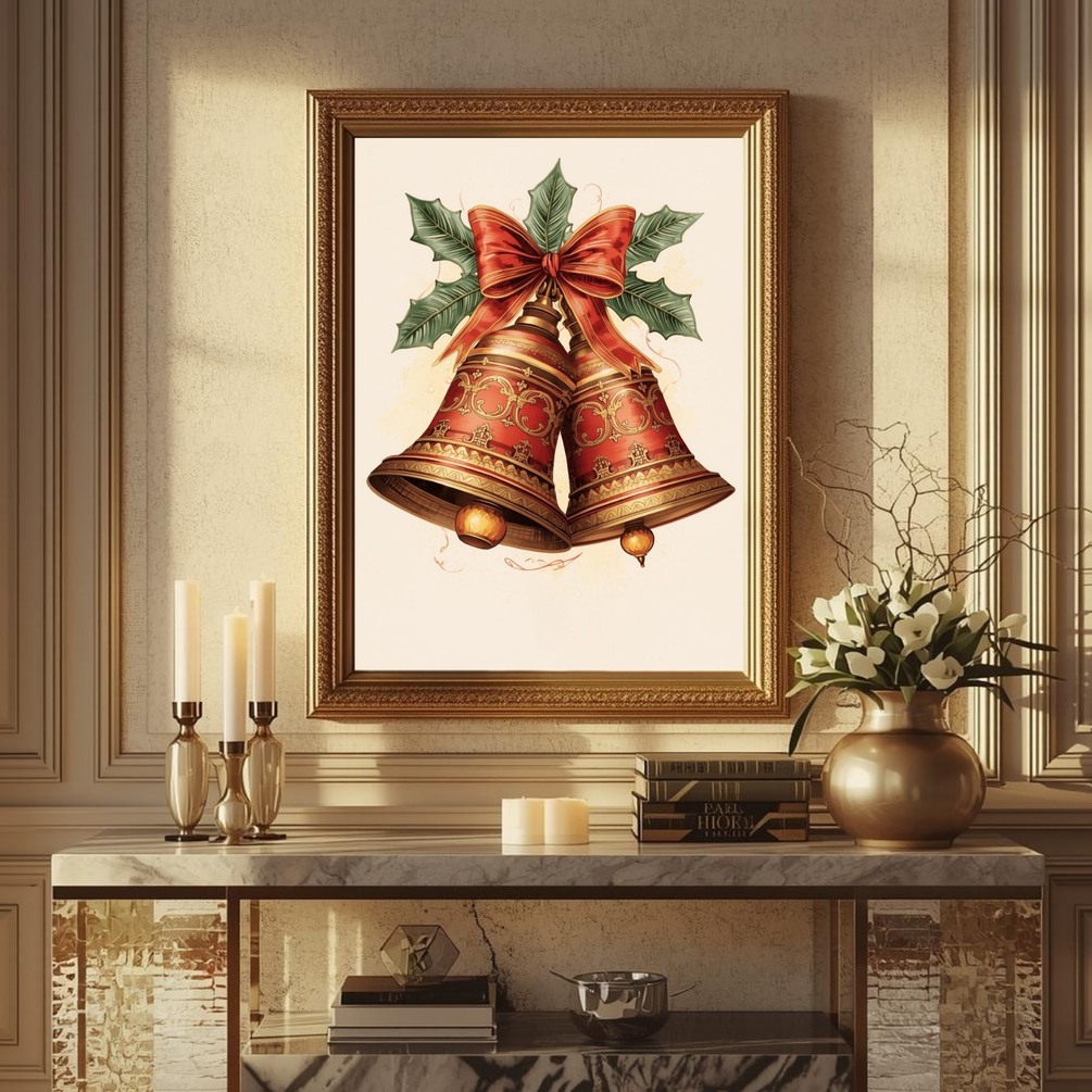 Celebrate the joyful sound of Christmas with this elegant Vintage Christmas Bells wall art. Featuring intricate gold detailing, lush holly leaves, and a classic red ribbon, this piece captures the timeless warmth of family gatherings and the spirit of love that fills the holidays.